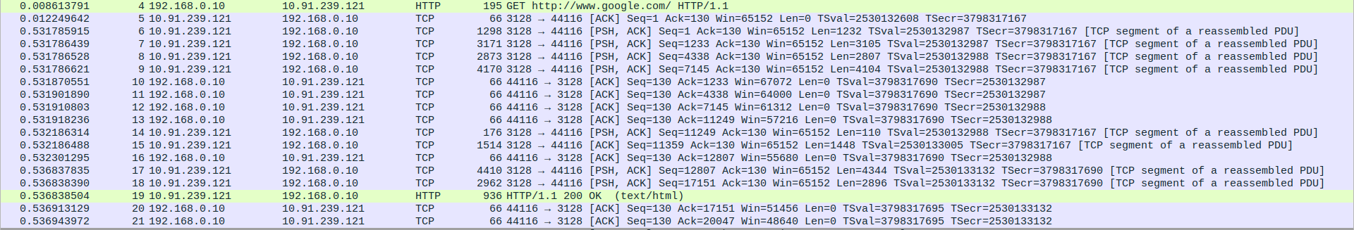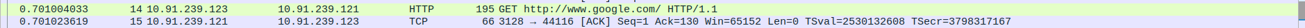 Packet 4: The client (10.91.239.123) sends an HTTP GET request to the proxy(10.91.239.121) for http://www.google.com/.