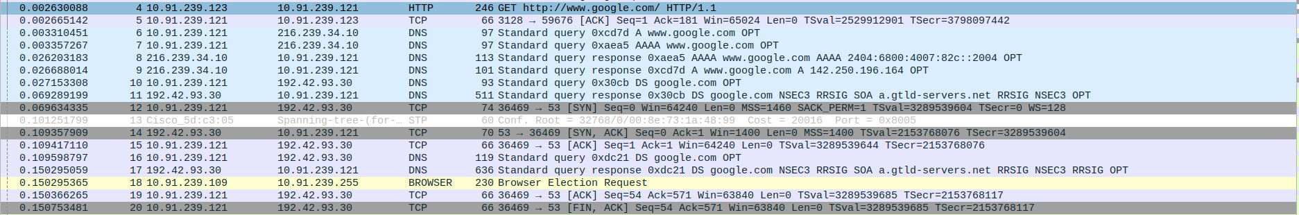 Packet 6: DNS query (A record) sent to resolve IPv4 address for www.google.com from server (10.91.239.121) to DNS server (216.239.34.10).