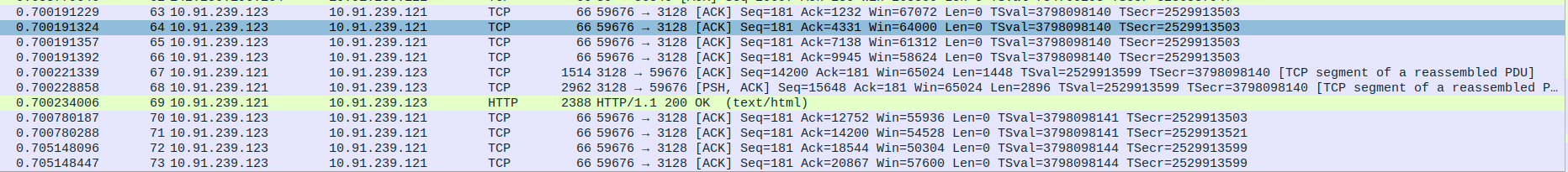 Packets 70–71: ACK packets from the proxy to the client, confirming the receipt of data.