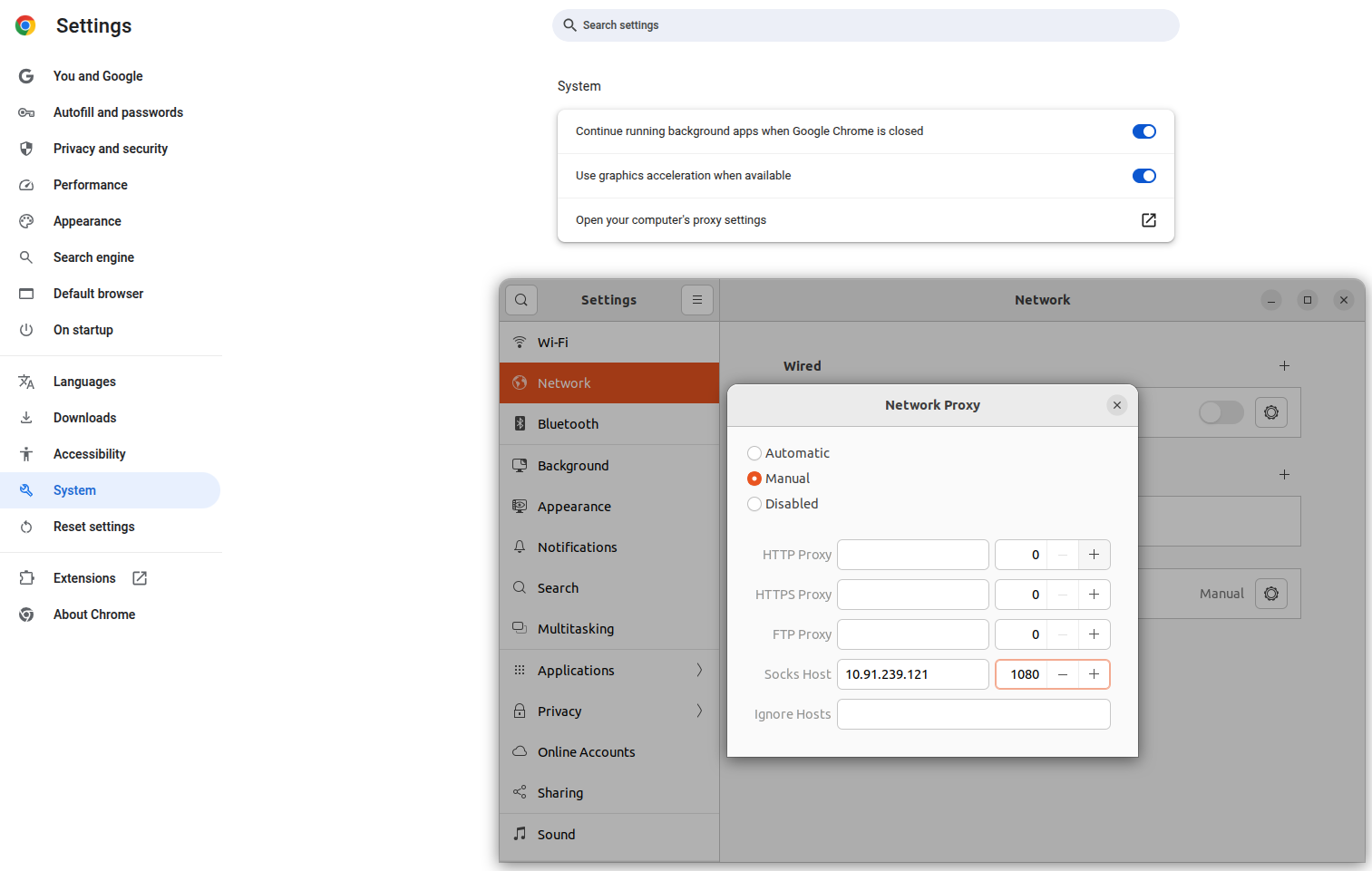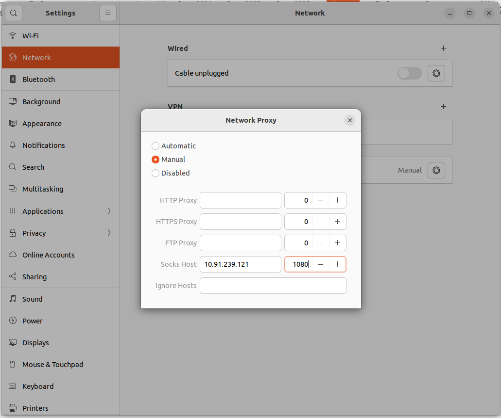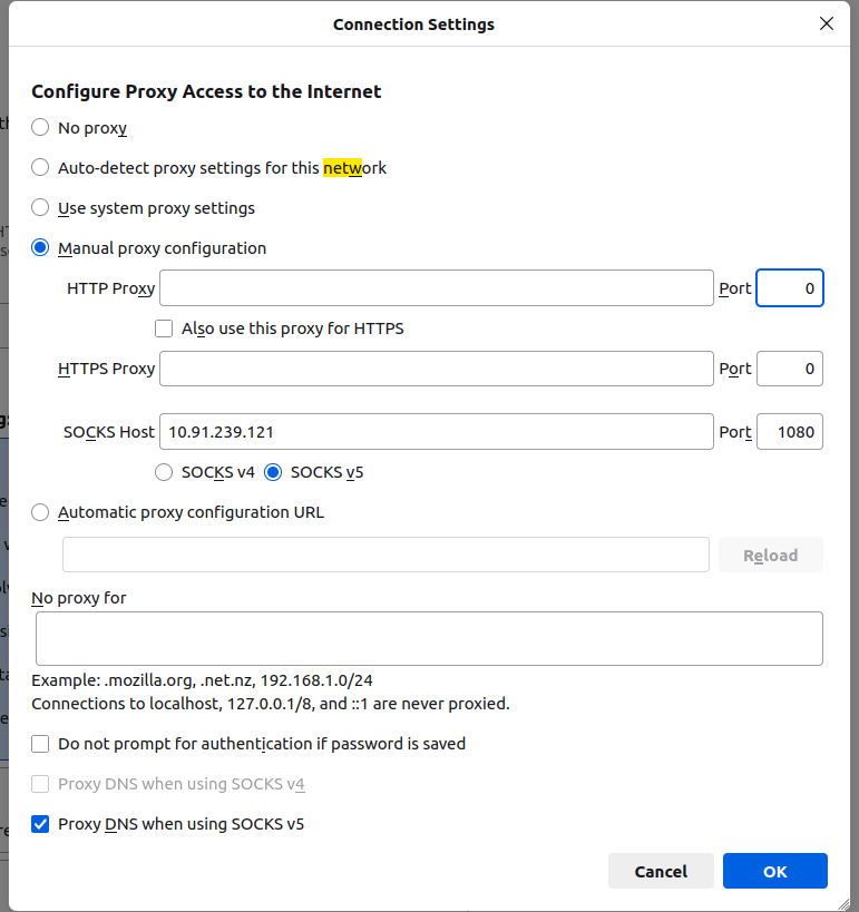 SOCKS5 Proxy: Enter the IP address of your proxy server (e.g., 10.91.239.13).
