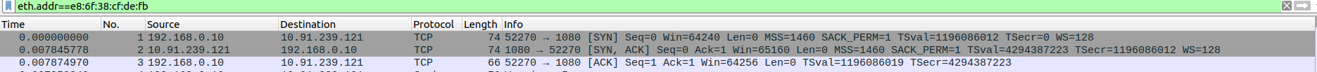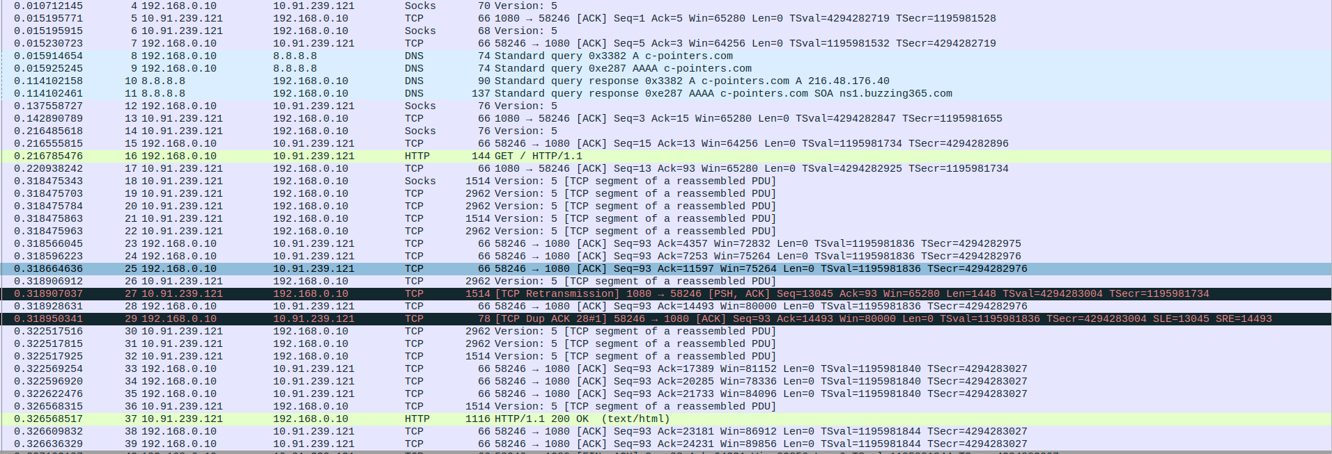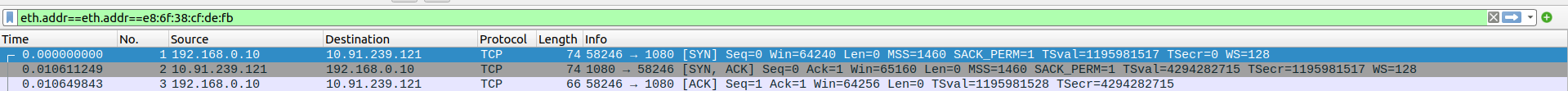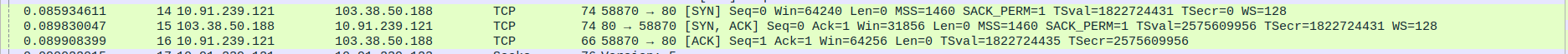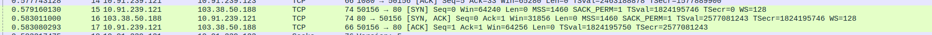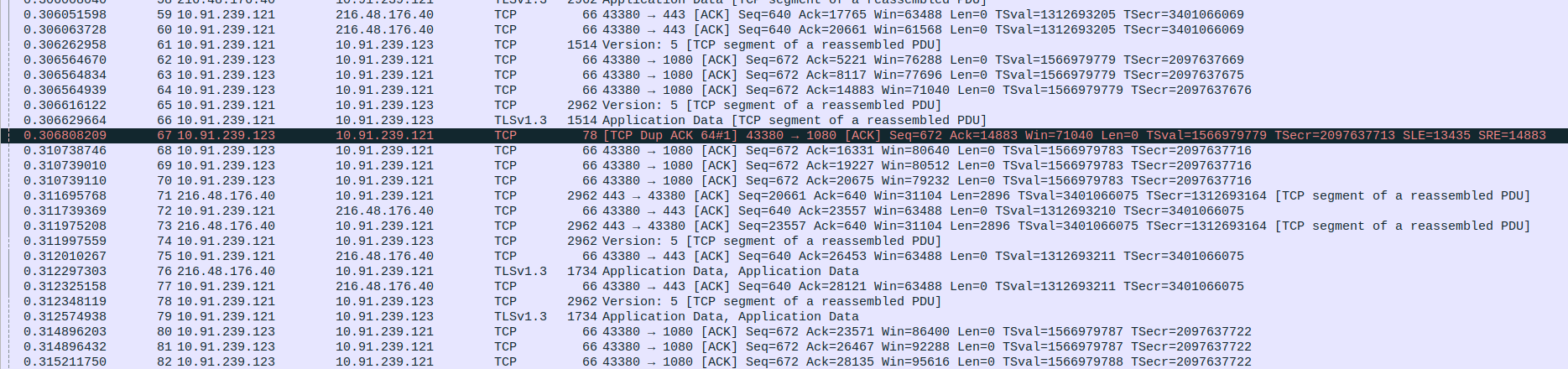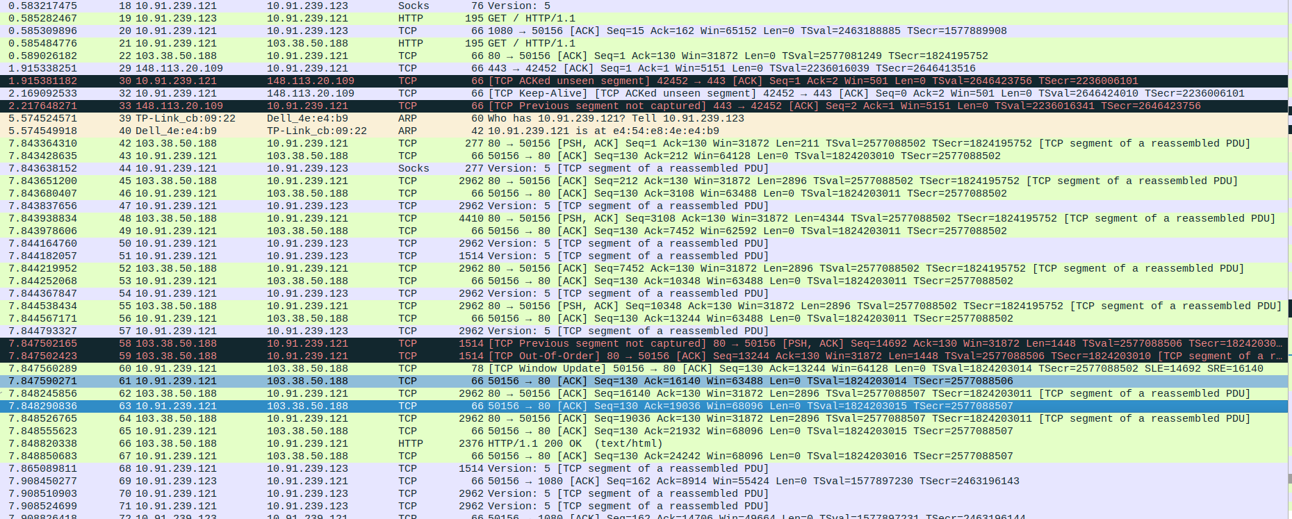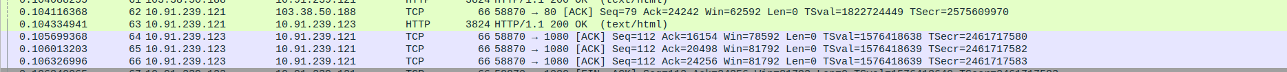 Packet 67: Proxy (10.91.239.121) → Webserver (103.38.50.188) – ACK for HTTP 200 OK, 66 bytes.