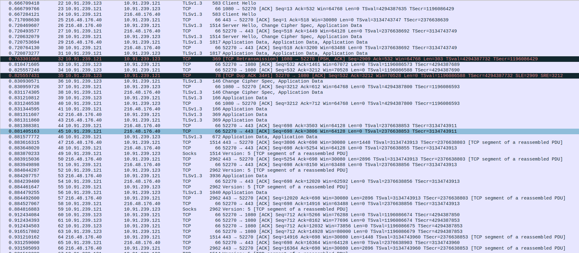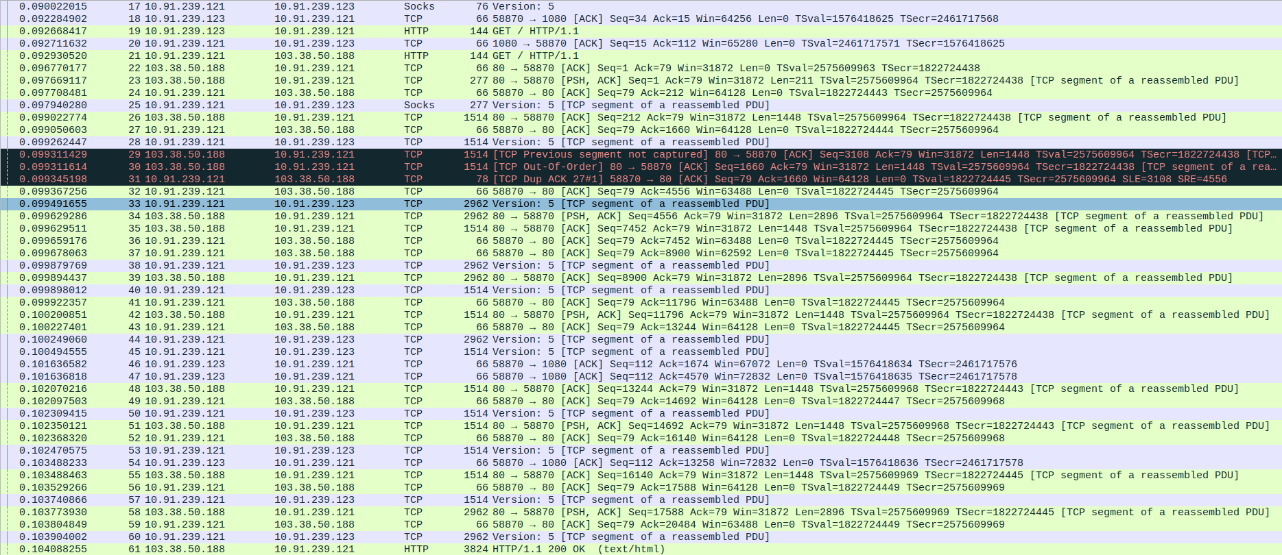 Packet 63: Proxy (10.91.239.121) → webserver (103.38.50.188) – ACK for 2896 bytes, 66 bytes.