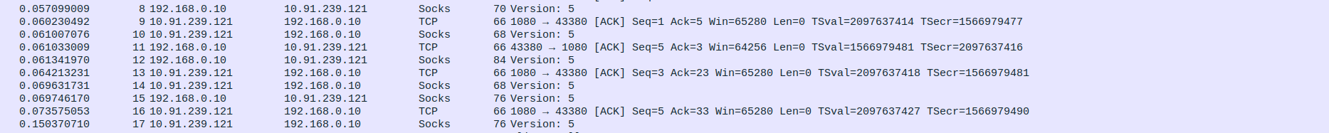 test:~$ sudo nano /etc/danted.conf logoutput: stderr internal: 10.91.239.121 port = 1080 external: 10.91.239.121 socksmethod: username user.privileged: root user.unprivileged: nobody client pass { from: 0.0.0.0/0 to: 0.0.0.0/0 log: connect disconnect } socks pass { from: 0.0.0.0/0 to: 0.0.0.0/0 log: connect disconnect }