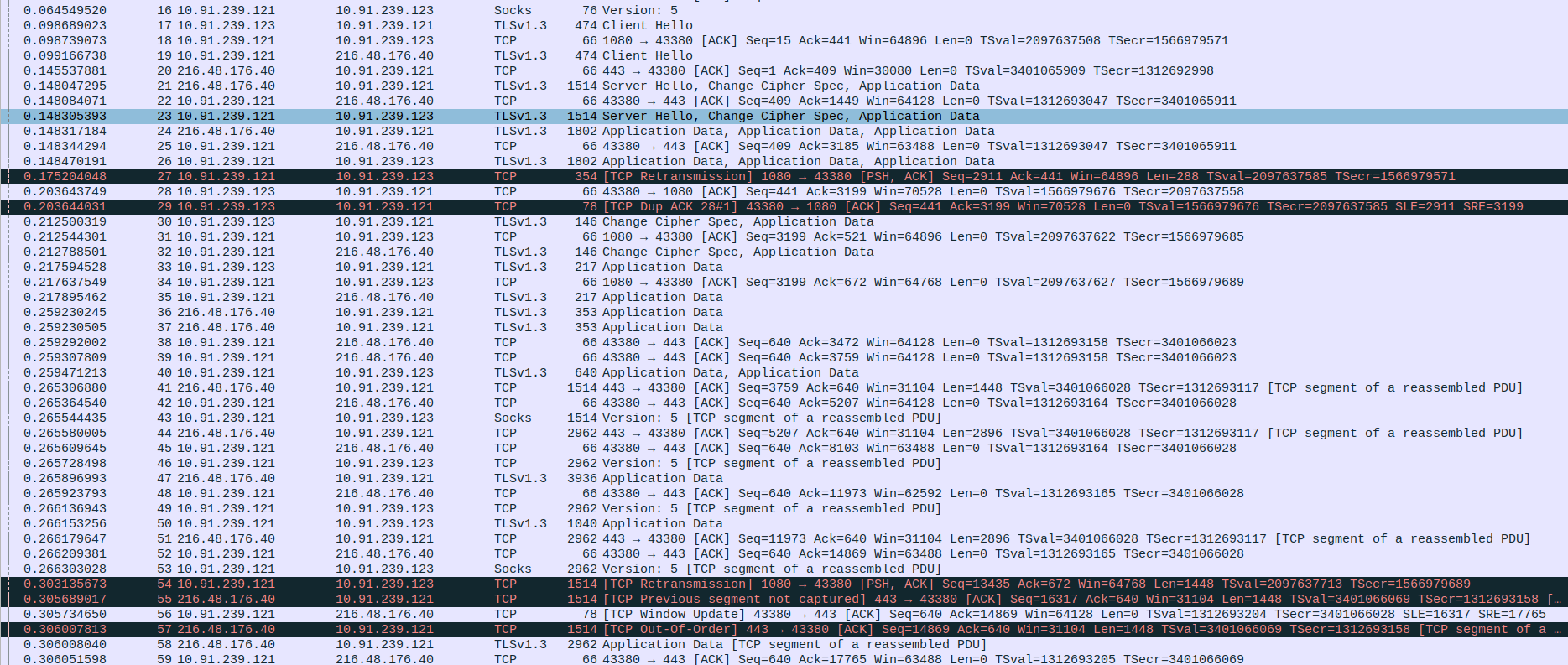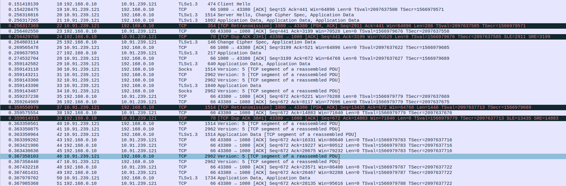 Packet 56: Proxy (10.91.239.121) → webserver (103.38.50.188) – ACK for another 2896 bytes, 66 bytes.