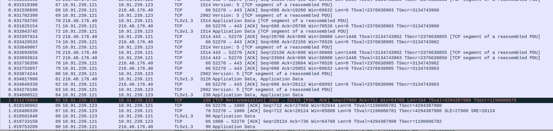 Packet 76: Client (10.91.239.123) → Proxy (10.91.239.121) – ACK for complete HTTP response, 66 bytes.