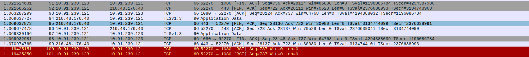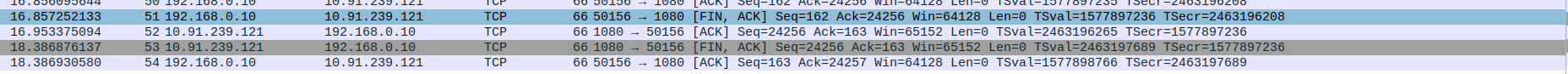 Packet 77: Client (10.91.239.123) → Proxy (10.91.239.121) – FIN, ACK to close client-proxy connection