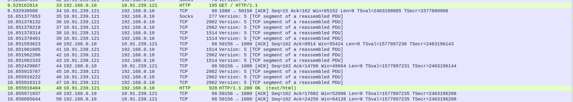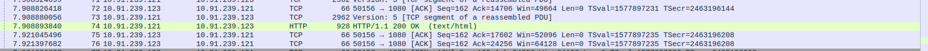Packet 70–74: Proxy (10.91.239.121) → Client (10.91.239.123) – Final HTTP/1.1 200 OK response segments (multiple, including 2962, 928 bytes).