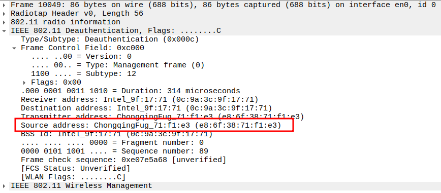 MAC address of the device sending the deauthentication frame (AP or STA).
