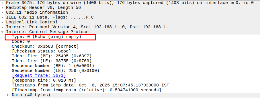The ICMP Echo Reply is sent by the AP back to the STA in response to the Echo Request.