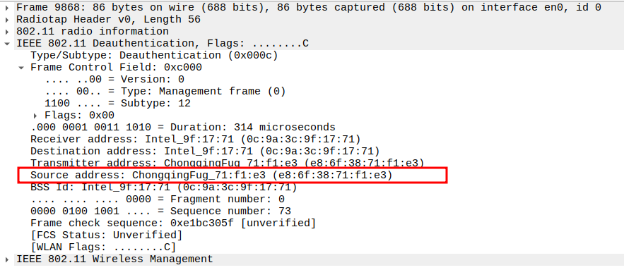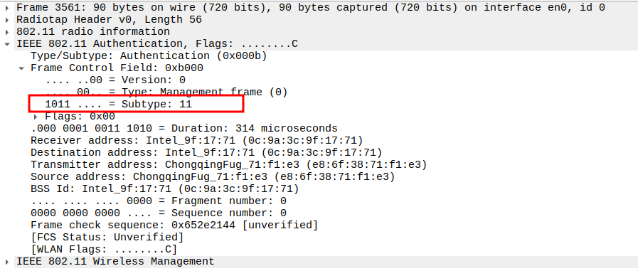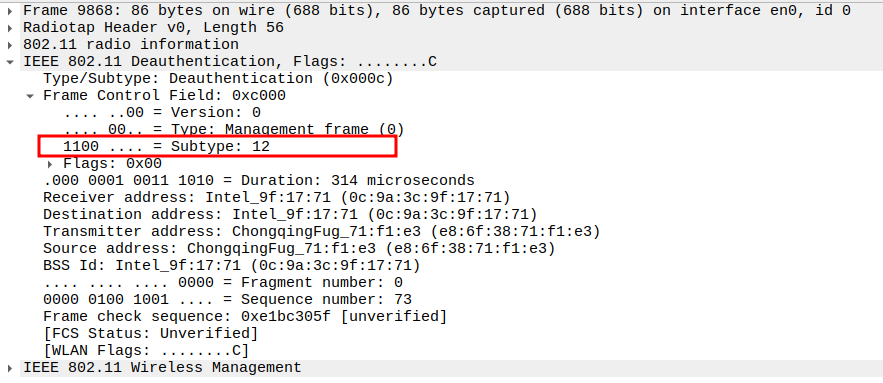 Subtype = 12 identifies the frame as Deauthentication.