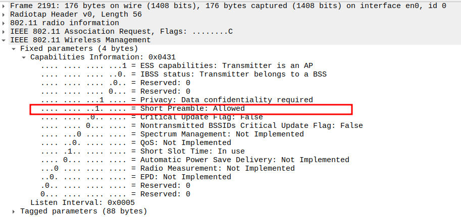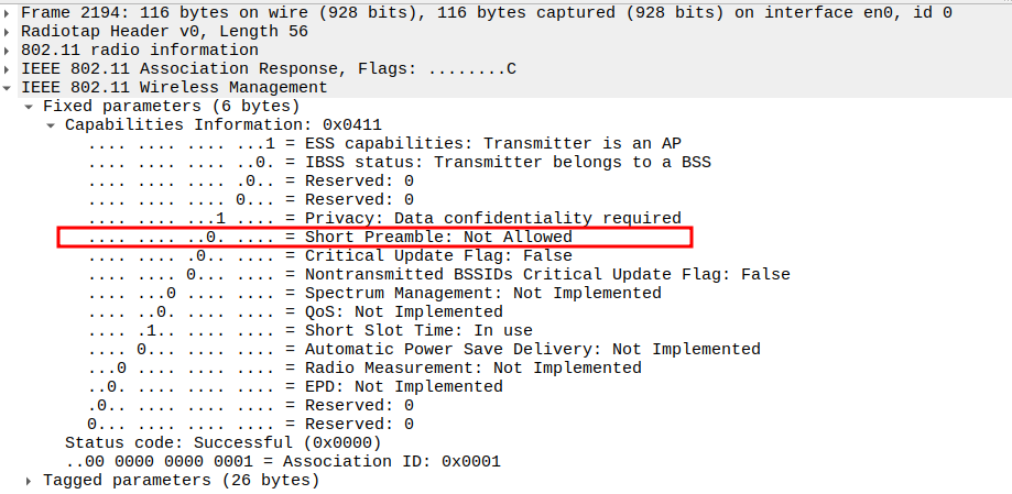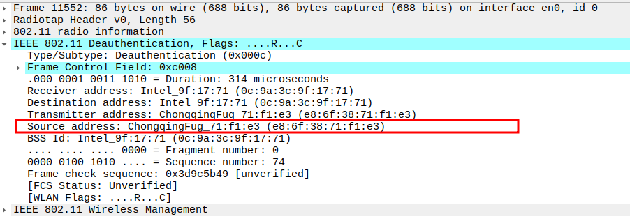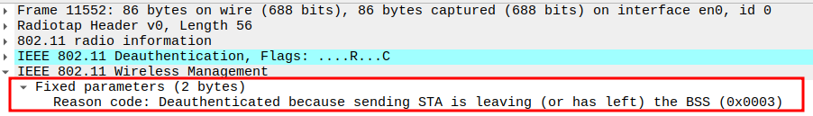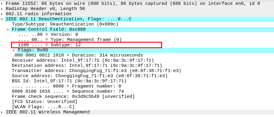 Subtype = 12 identifies the frame as Deauthentication.