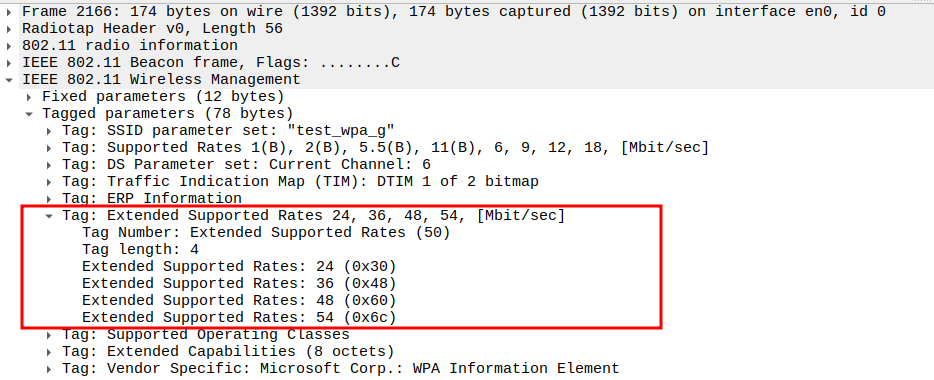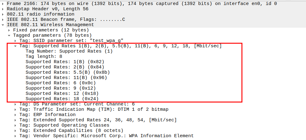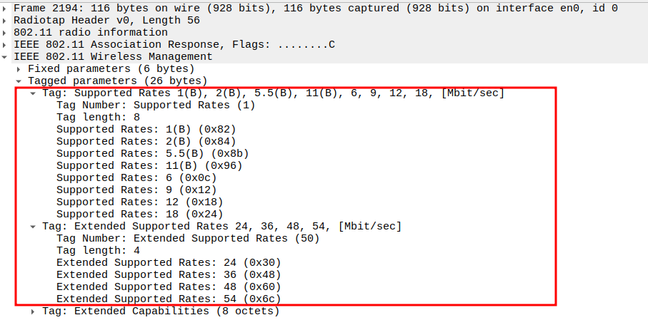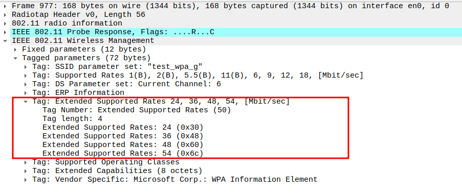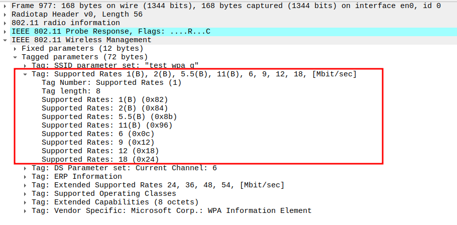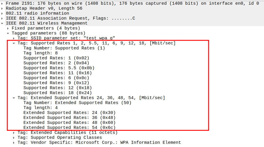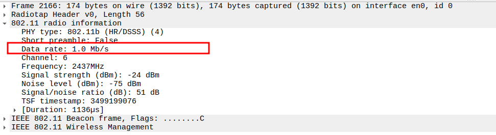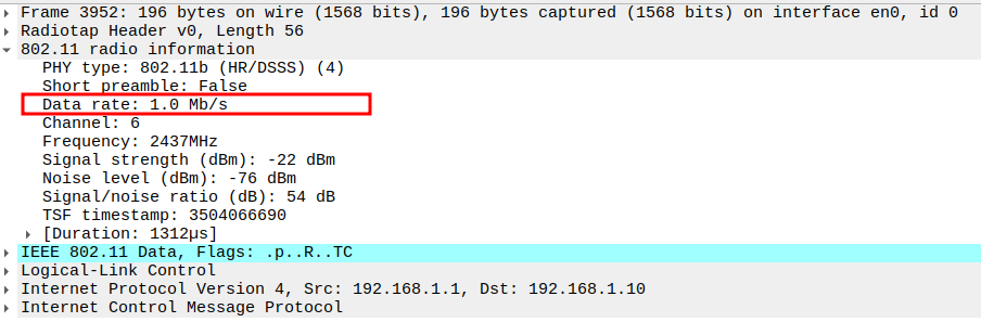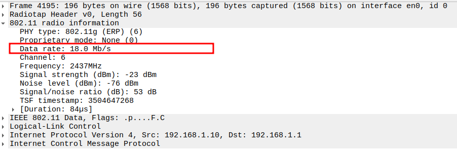 Data Rate indicates the PHY rate used by the STA (e.g., 24 Mbps or 36 Mbps).