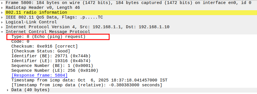 The ICMP Echo Reply is sent by the AP back to the STA in response to the Echo Request.
